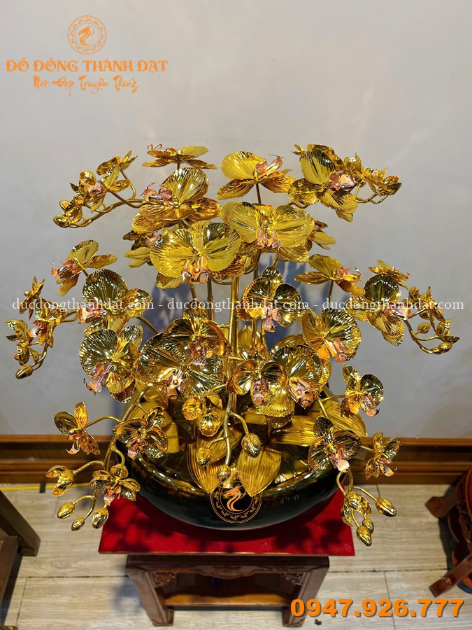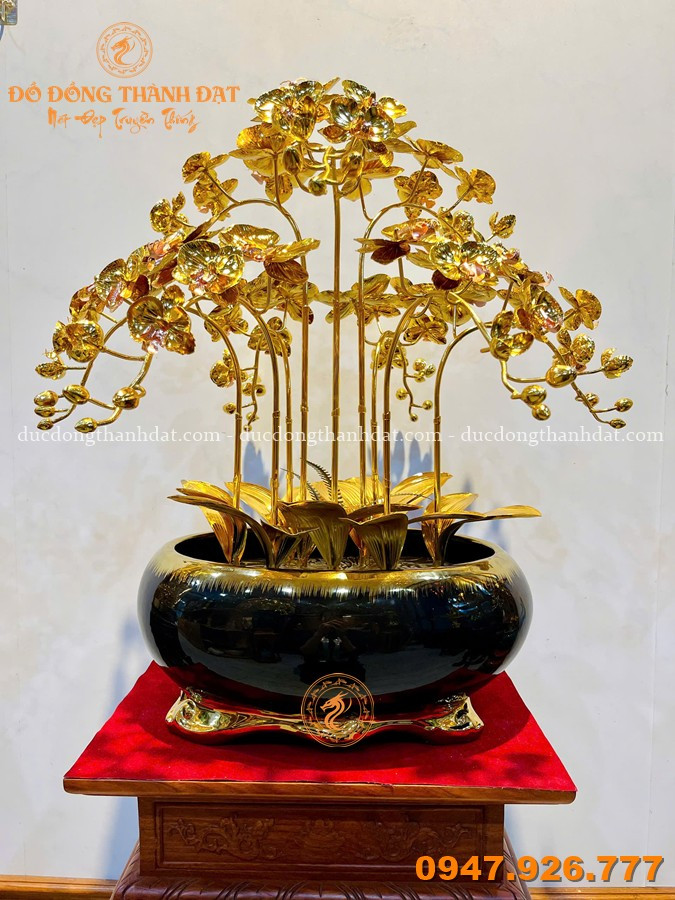 Chậu lan vàng phú quý mạ vàng 24K 9 cành kích thước 53x58cm là dòng sản phẩm cao cấp được chế tác tinh xảo tại Đúc Đồng Thành Đạt – đơn vị uy tín trong lĩnh vực đúc đồng và quà tặng mạ vàng.