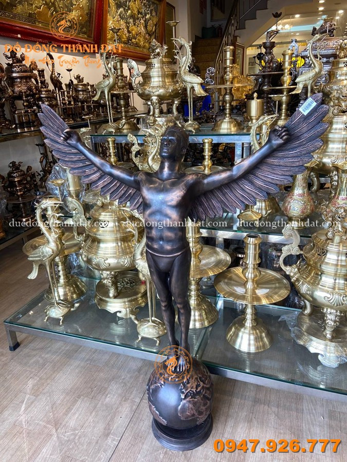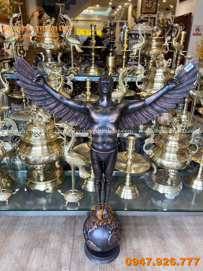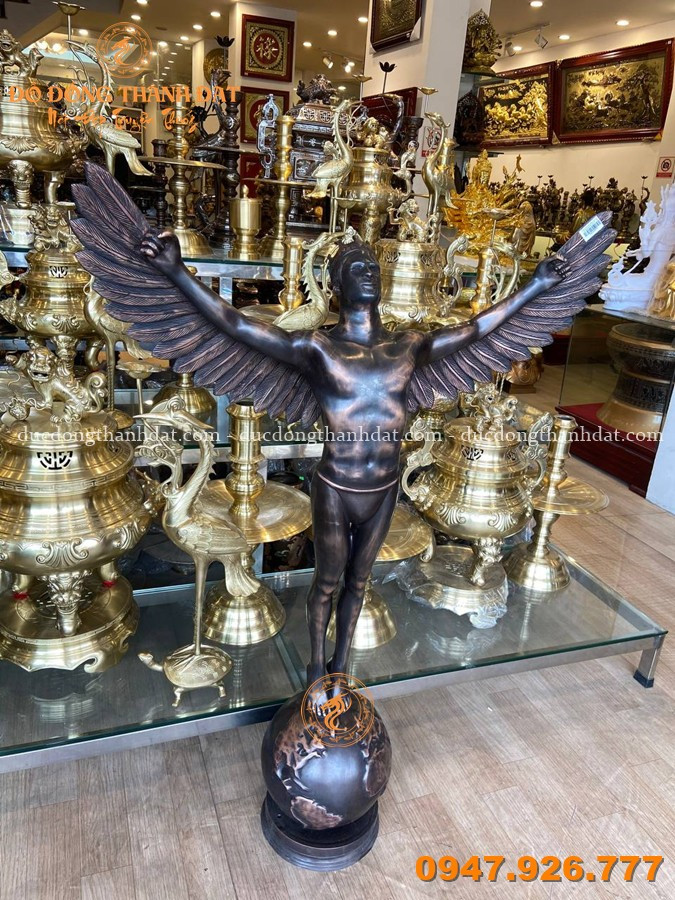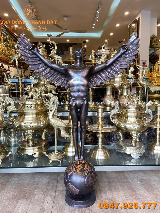 Sản phẩm đúc tượng người đứng quả địa cầu cao 1m2 tại Đúc Đồng Thành Đạt được thiết kế với bố cục hài hòa giữa con người và quả địa cầu – tạo nên tổng thể mạnh mẽ, hiện đại nhưng vẫn mang giá trị nghệ thuật cao.