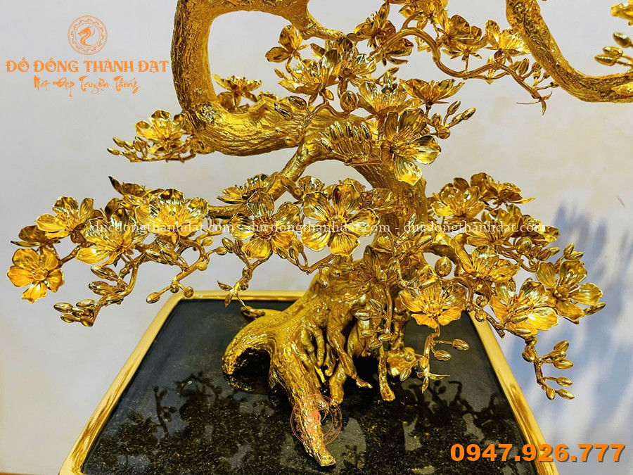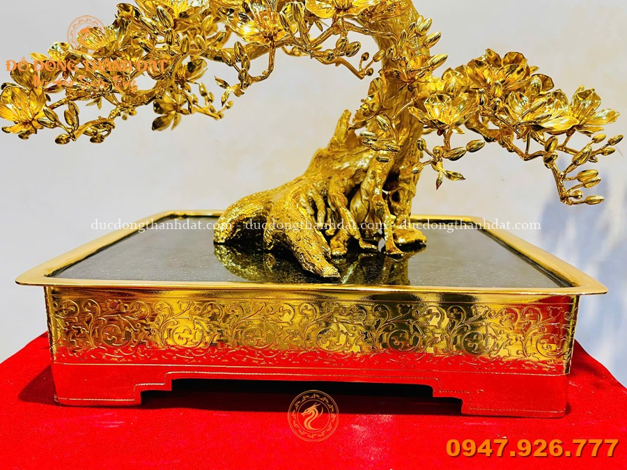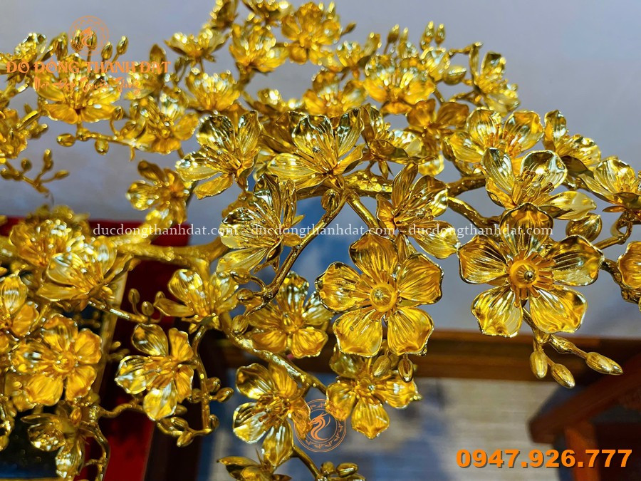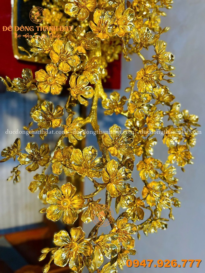 Điểm đặc biệt nằm ở lớp mạ vàng 24K phủ kín toàn bộ (full), không chỉ mang lại giá trị thẩm mỹ cao mà còn làm nổi bật từng chi tiết nhỏ – từ cánh hoa, nhụy hoa cho đến từng đường gân lá. Khi ánh sáng chạm vào, toàn bộ tác phẩm như bừng sáng, nhưng vẫn giữ được sự sang trọng rất “trầm”.
