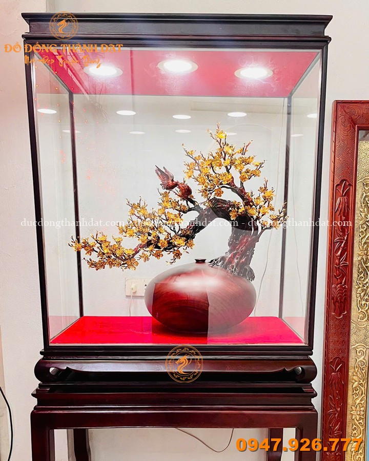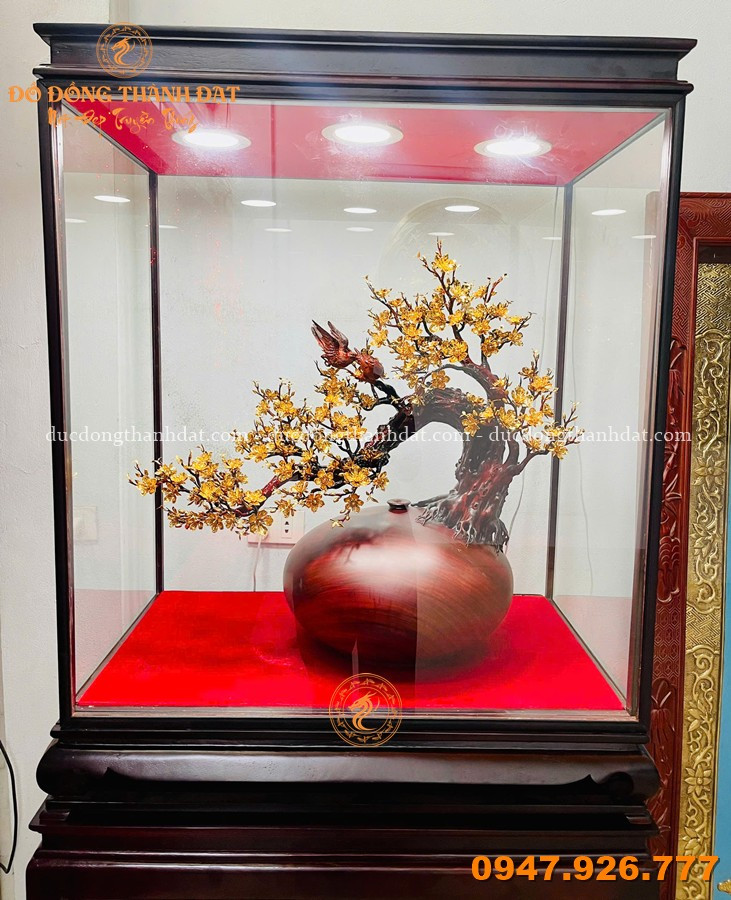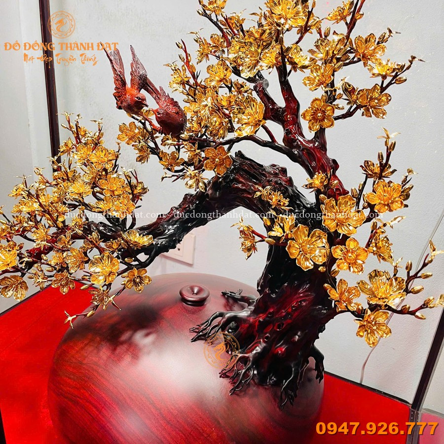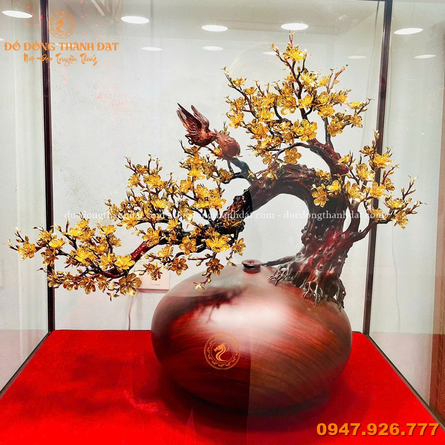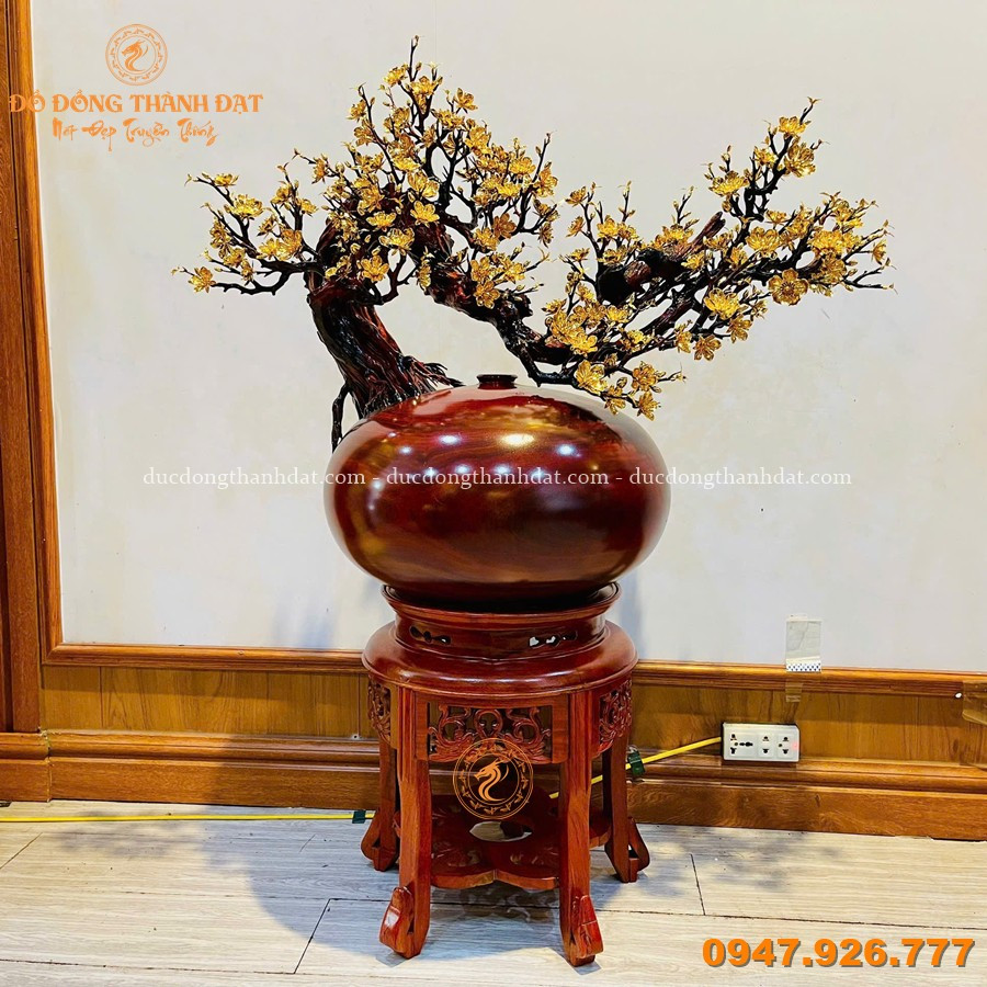 Mẫu mai vàng phú quý mạ vàng 24K bình gỗ nu được sản xuất tại Đúc Đồng Thành Đạt là sự kết hợp hoàn hảo giữa: