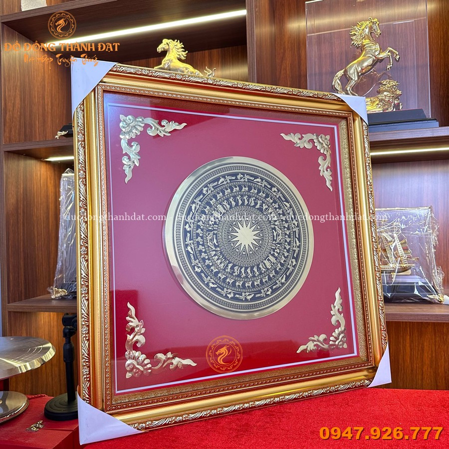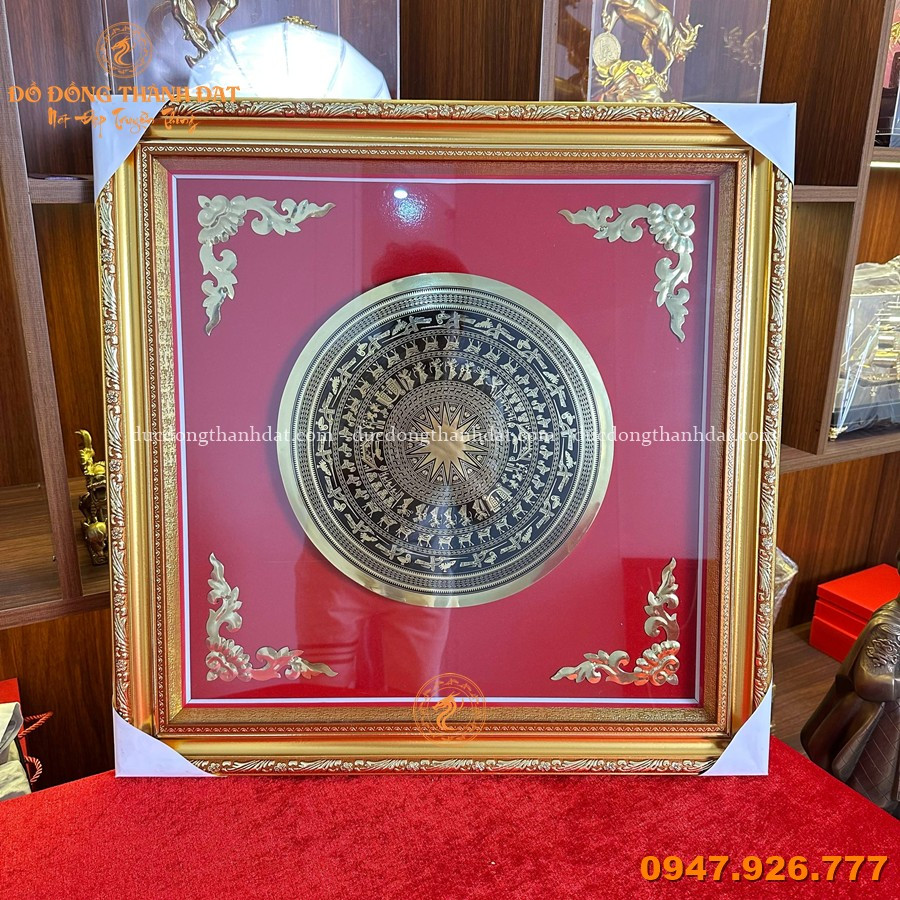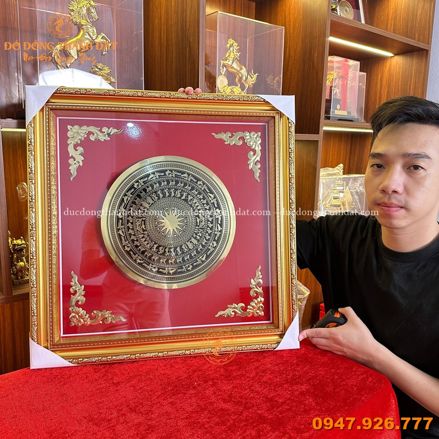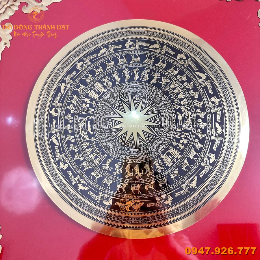 Sản phẩm được chế tác thủ công từ đồng, tái hiện chính xác hoa văn trống đồng Đông Sơn nổi bật ở trung tâm.