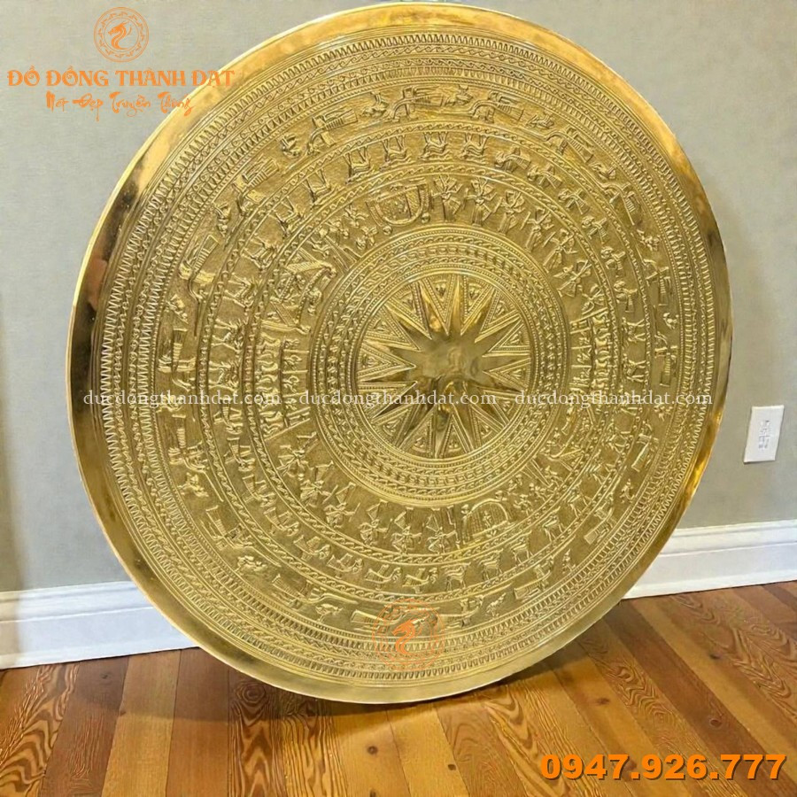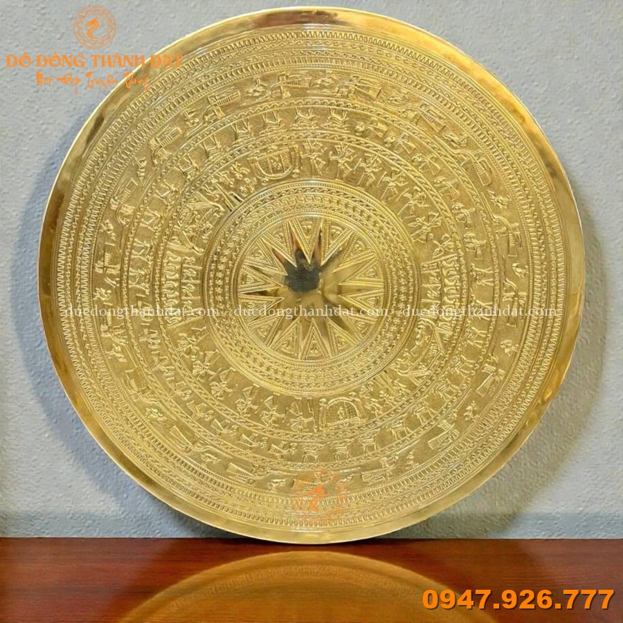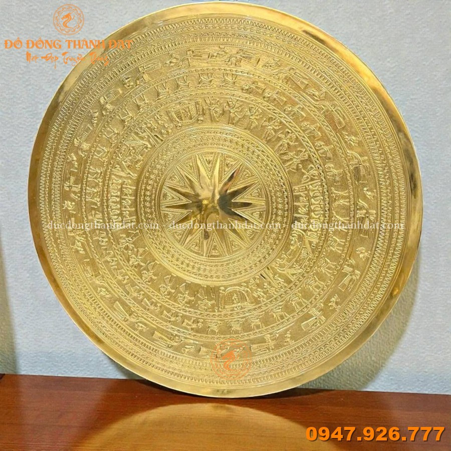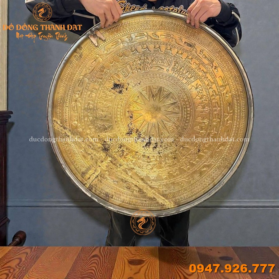 Mặt trống đồng gò thúc đồng vàng 70cm là dòng sản phẩm được nhiều khách hàng lựa chọn nhờ ưu điểm mỏng – nhẹ – họa tiết sắc nét – giá thành hợp lý. Sản phẩm được chế tác thủ công từ đồng vàng tấm, sử dụng kỹ thuật gò – thúc – chạm truyền thống của làng nghề Ý Yên, giúp các họa tiết trống Đông Sơn nổi rõ và có chiều sâu nghệ thuật.