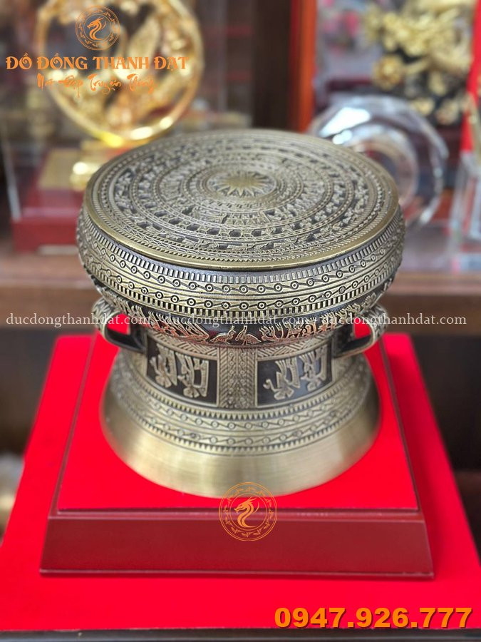 Quả trống đồng quà tặng màu hun giả cổ đường kính 20cm là mẫu quà lưu niệm cao cấp đang được nhiều cơ quan, doanh nghiệp và khách hàng cá nhân lựa chọn. Sản phẩm được chế tác từ đồng vàng nguyên chất, hoàn thiện bề mặt bằng kỹ thuật hun giả cổ tạo màu nâu trầm sang trọng, mang vẻ đẹp cổ kính như trống đồng Đông Sơn nguyên bản.