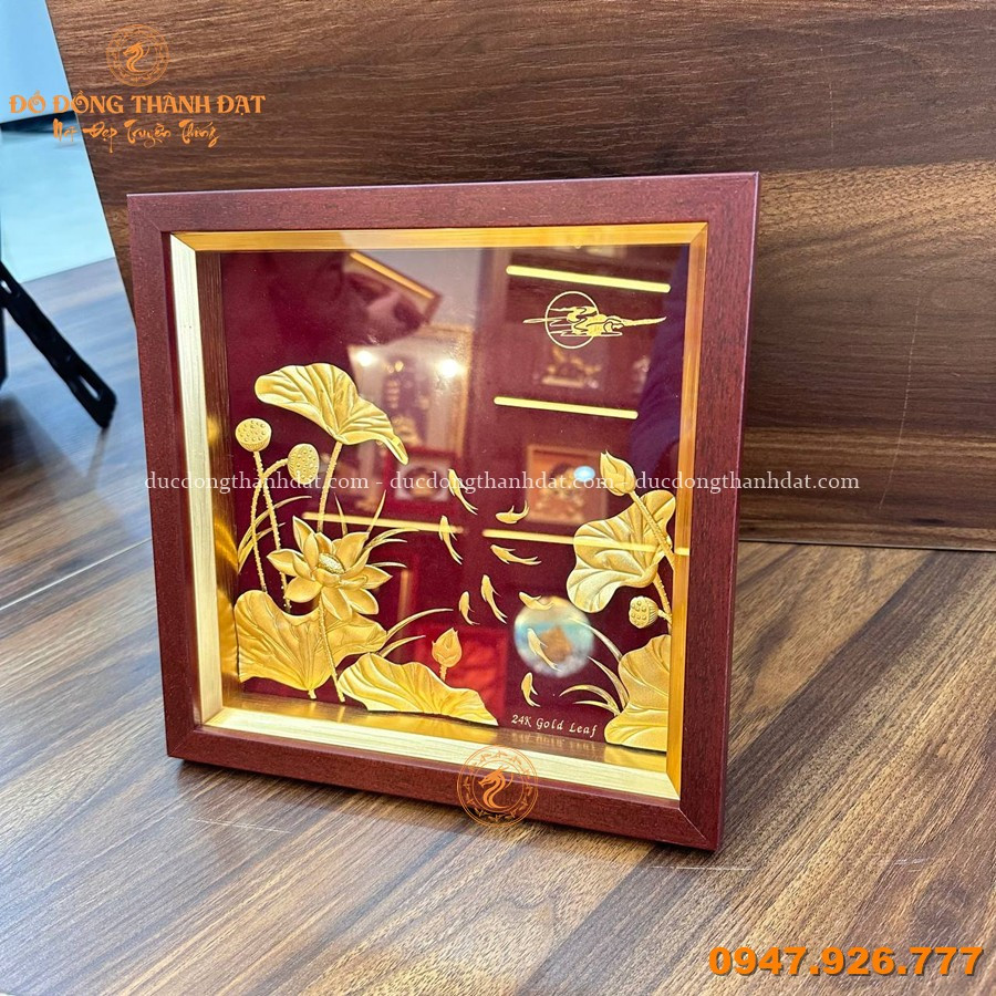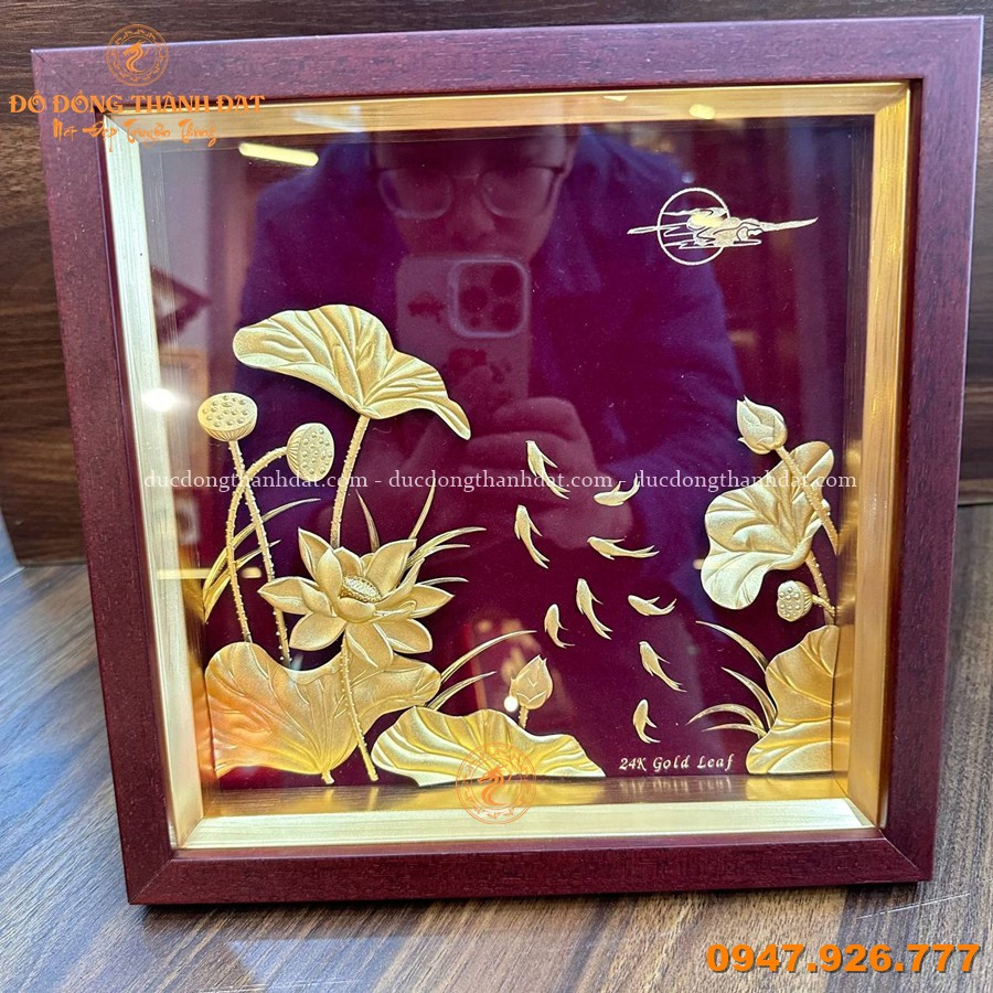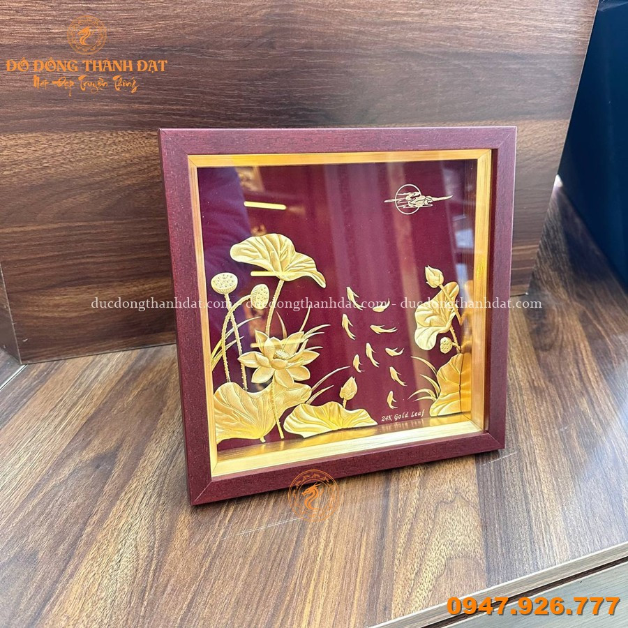 Bố cục tranh cân đối, hoa sen được chạm nổi tinh tế tạo chiều sâu. Lớp vàng 24K giúp sản phẩm luôn sáng bóng, bền đẹp theo thời gian.