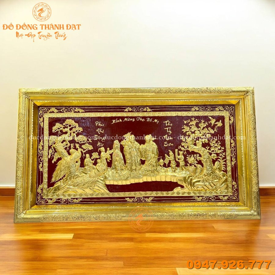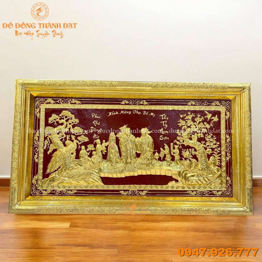 Tranh mừng thọ dát vàng 9999 khung đồng kt: 1m35 x 75cm là một trong những mẫu tranh đồng cao cấp được ưa chuộng tại Đúc Đồng Thành Đạt được dùng làm quà tặng cụ ông, bà nhân kỉ niệm ngày mừng thọ vô cùng ý nghĩa