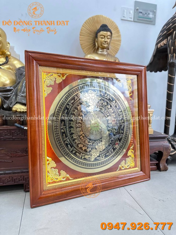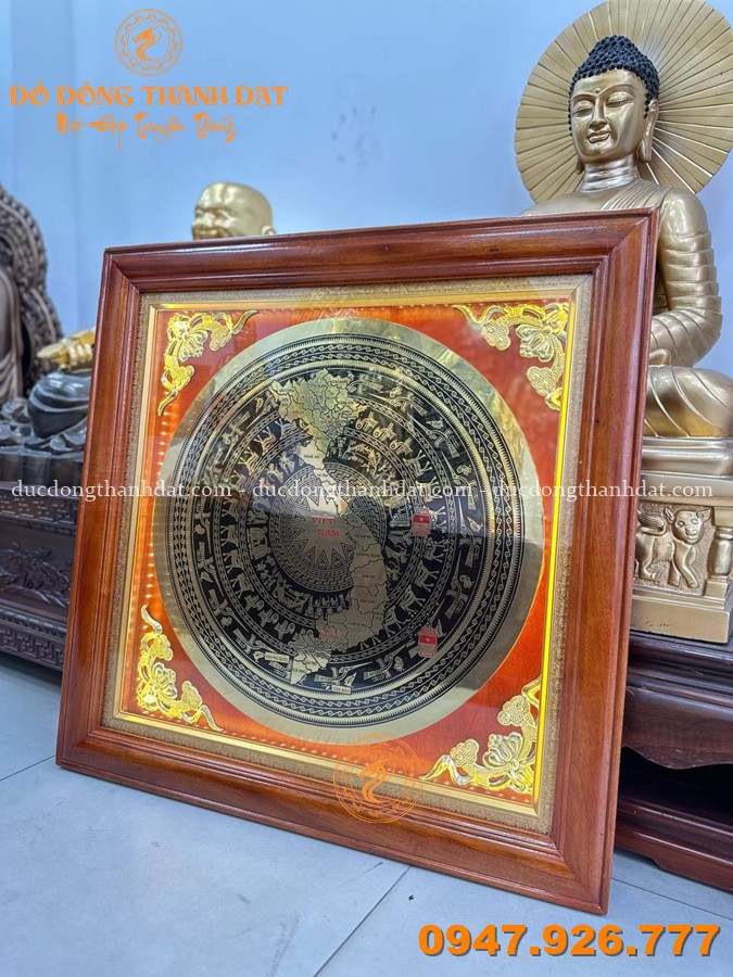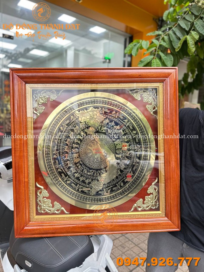 Tranh trống đồng có bản đồ khung 90cm có LED là một trong những dòng tranh phong thủy – trang trí được yêu thích nhất tại Đúc Đồng Thành Đạt. Sự kết hợp giữa hoa văn trống đồng Đông Sơn và hình bản đồ Việt Nam tạo nên một tác phẩm mang giá trị văn hóa, lịch sử và tinh thần dân tộc vô cùng sâu sắc.