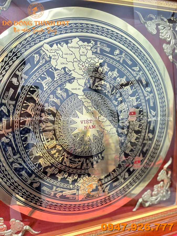 Một điểm đặc biệt ở mẫu tranh này là đèn LED gắn âm bên trong khung, tạo hiệu ứng nổi bật cho mặt trống đồng và bản đồ.