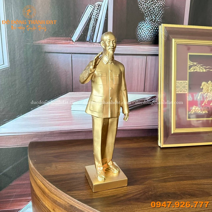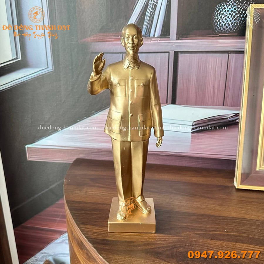 Tượng Bác Hồ đứng đồng vàng cao 30cm là mẫu tượng để bàn được nhiều cơ quan, doanh nghiệp và gia đình lựa chọn bởi kích thước vừa phải, hình dáng cân đối, thể hiện thần thái trang nghiêm mà gần gũi.