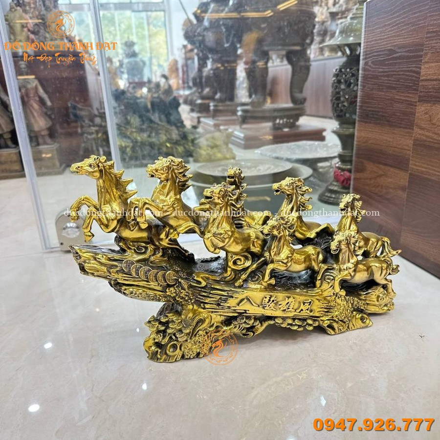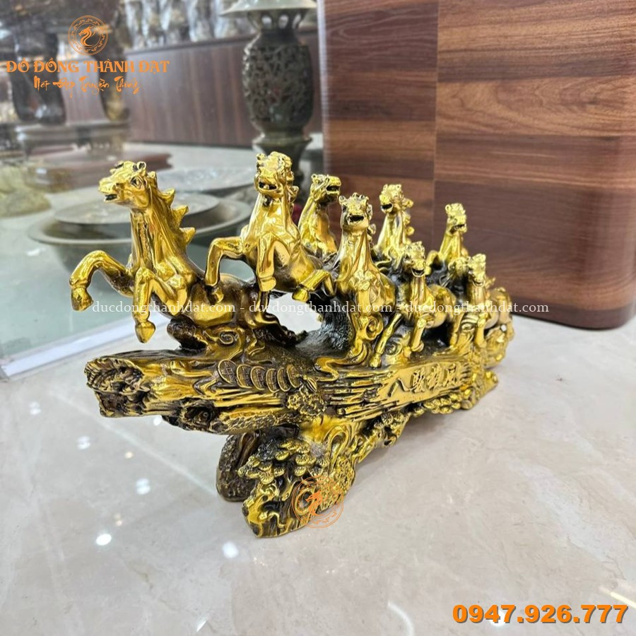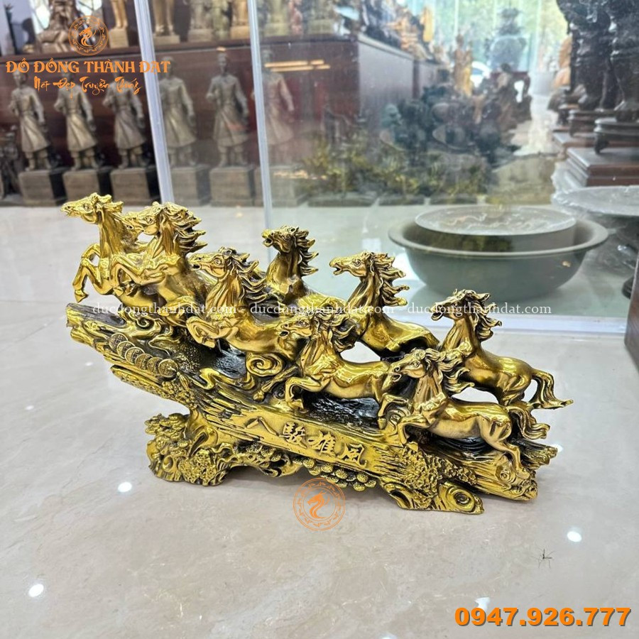 Tượng bát mã bằng đồng dài 50cm được đúc thủ công tinh xảo, khắc họa hình ảnh 8 chú ngựa phi nước đại trên nền sóng và tiền xu, thể hiện tinh thần mạnh mẽ, đoàn kết và tốc độ. Các chi tiết bờm, dáng ngựa và thế chuyển động được làm rõ, tạo tổng thể sinh động và có chiều sâu.