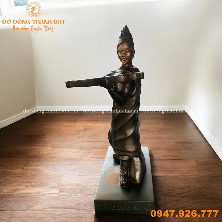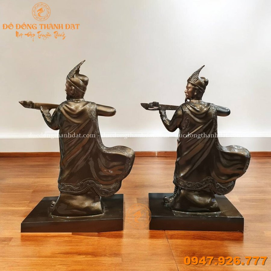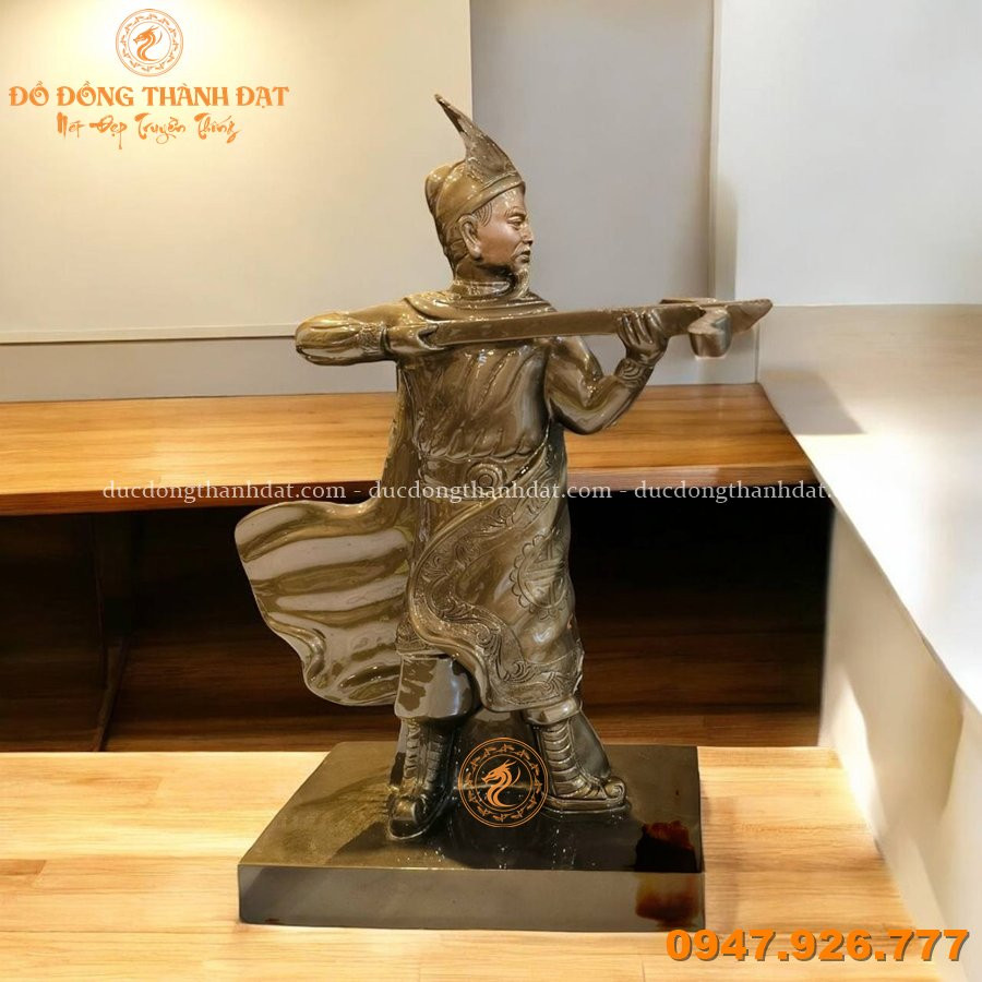 ✔ Hoa văn chạm khắc tinh tế: Các đường nét trên trang phục, mũ giáp và bệ tượng được chế tác tỉ mỉ, tái hiện rõ nét phong thái và khí chất của vị tướng tài thời An Dương Vương.