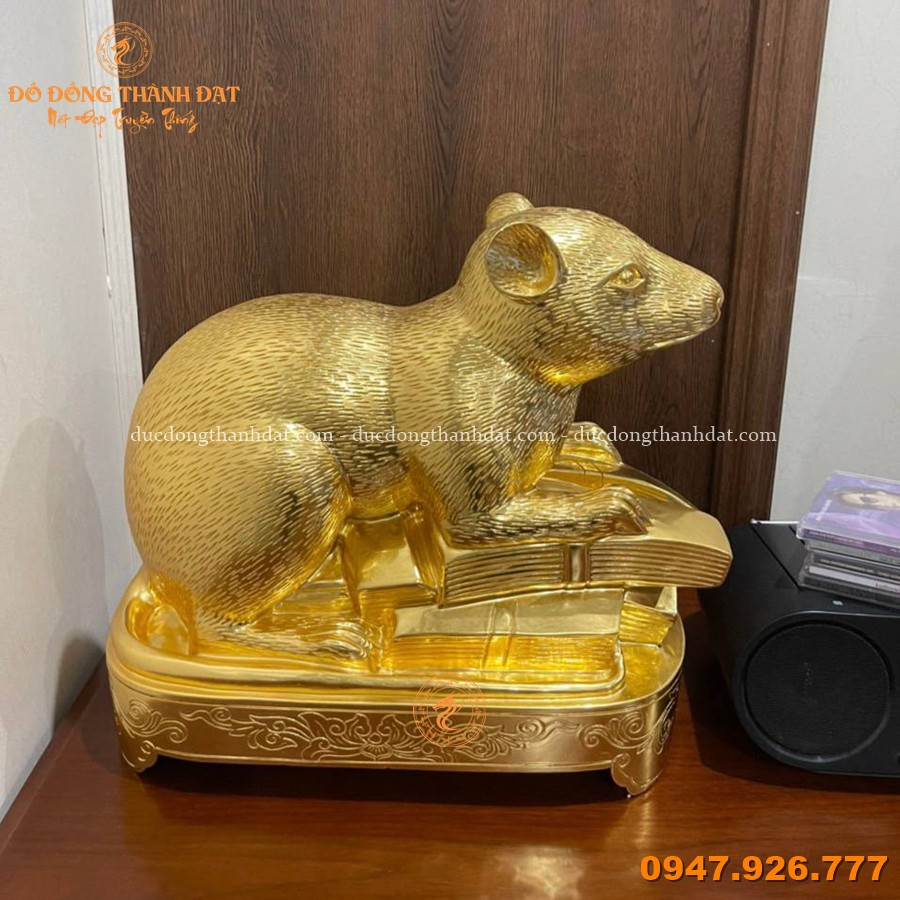 Mẫu Tượng chuột đồng đỏ dát vàng 24K dài 39cm được chế tác thủ công tại Đúc Đồng Thành Đạt, nổi bật với lớp vàng 24K sang trọng, đường nét sắc sảo thần thái sống động. Đây một trong những mẫu linh vật phong thủy cao cấp được nhiều khách hàng lựa chọn làm quà tặng hoặc trang trí.