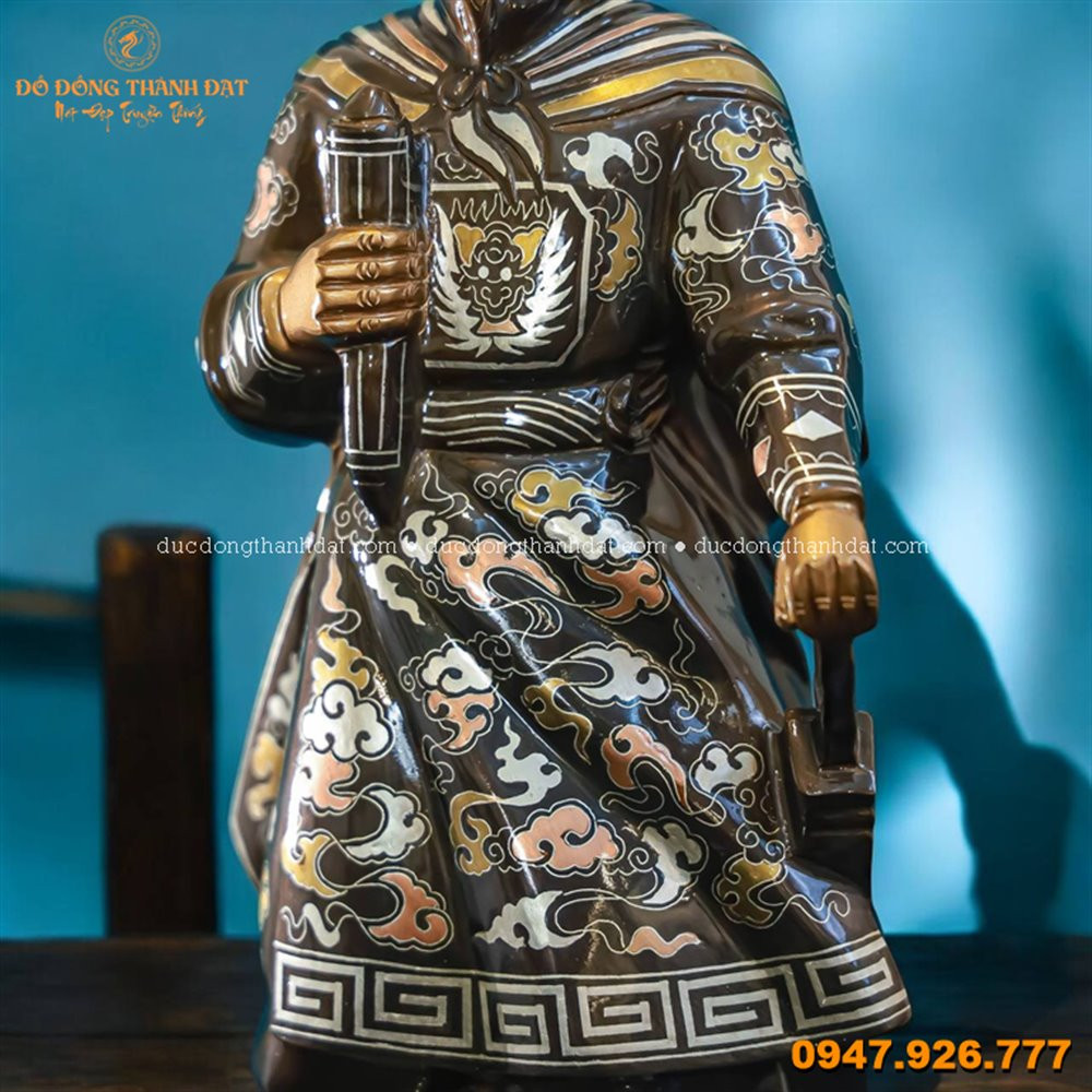Tượng đồng Trần Hưng Đạo khảm tam khí kỹ 50cm là dòng tượng cao cấp, được chế tác thủ công từ đồng đỏ nguyên khối, kết hợp kỹ thuật khảm tam khí (vàng – bạc – đồng) tinh xảo. Đây là mẫu tượng kích thước vừa phải, phù hợp trưng bày tại bàn làm việc, phòng khách hoặc làm quà tặng cao cấp.