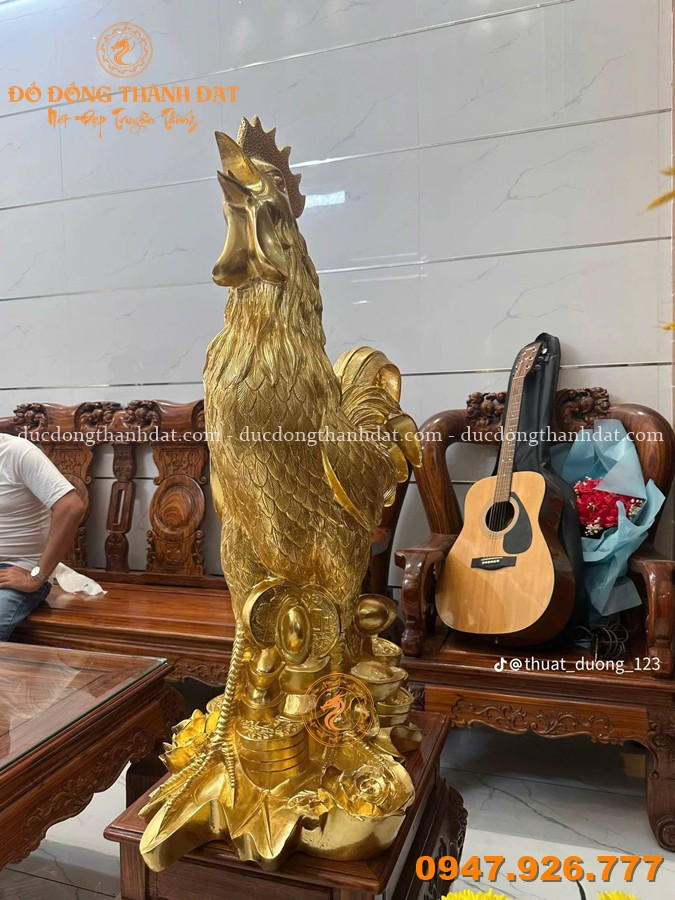Mẫu Tượng gà dát vàng 24K cao 68cm trong hình là một sản phẩm nghệ thuật cao cấp được chế tác tại Đúc Đồng Thành Đạt. Tượng có kích thước lớn, thiết kế sang trọng với lớp vàng 24K nổi bật, mang lại vẻ đẹp đẳng cấp cho không gian trưng bày.