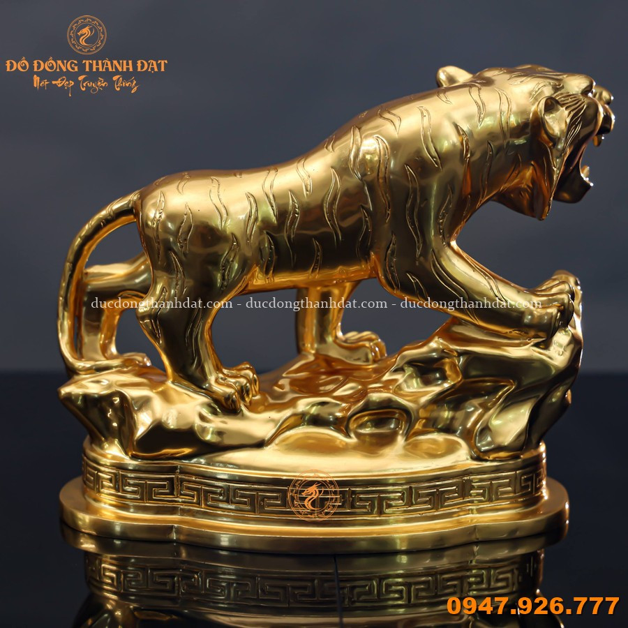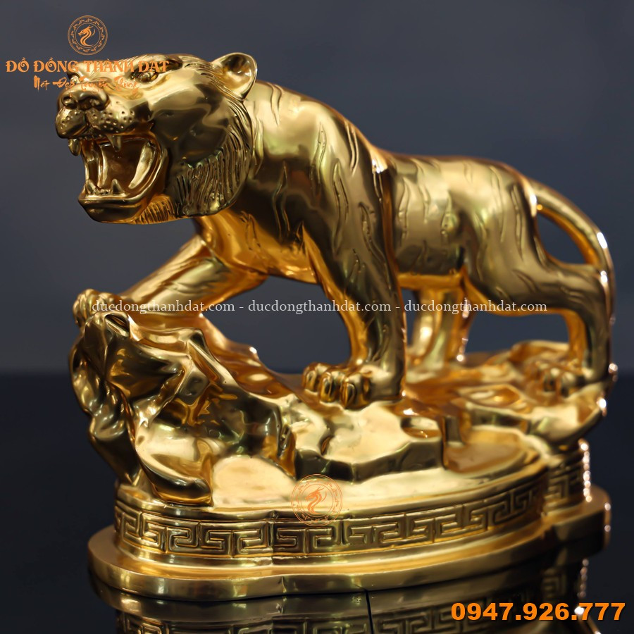 Tượng hổ bằng đồng mạ vàng 24K cao 16cm là mẫu linh vật phong thủy mini nhưng đầy uy lực, được chế tác tinh xảo tại Đúc Đồng Thành Đạt. Hình tượng hổ đứng trên bệ đá, miệng gầm mạnh mẽ, thể hiện khí chất của chúa sơn lâm – biểu tượng của quyền uy và sức mạnh.