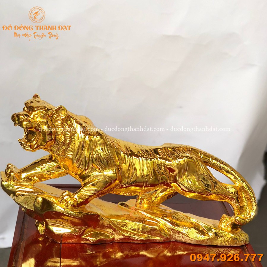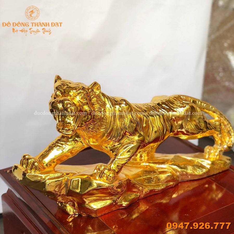 Tượng hổ bằng đồng mạ vàng nano cao 26cm dài 45cm là mẫu linh vật phong thủy nổi bật tại Đúc Đồng Thành Đạt, mang vẻ đẹp mạnh mẽ và sang trọng. Hình tượng hổ trong tư thế vươn mình, chân bám chắc trên bệ đá thể hiện sức mạnh, ý chí và tinh thần tiến lên không ngừng.