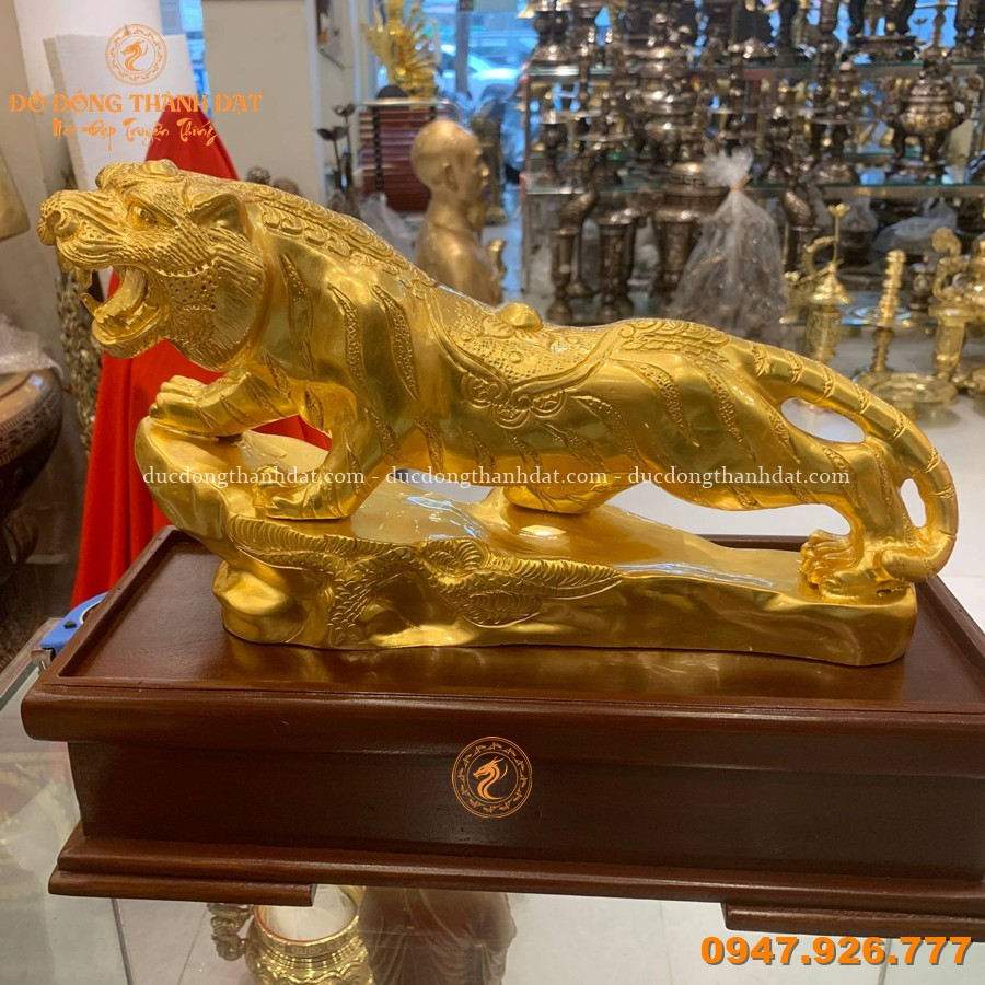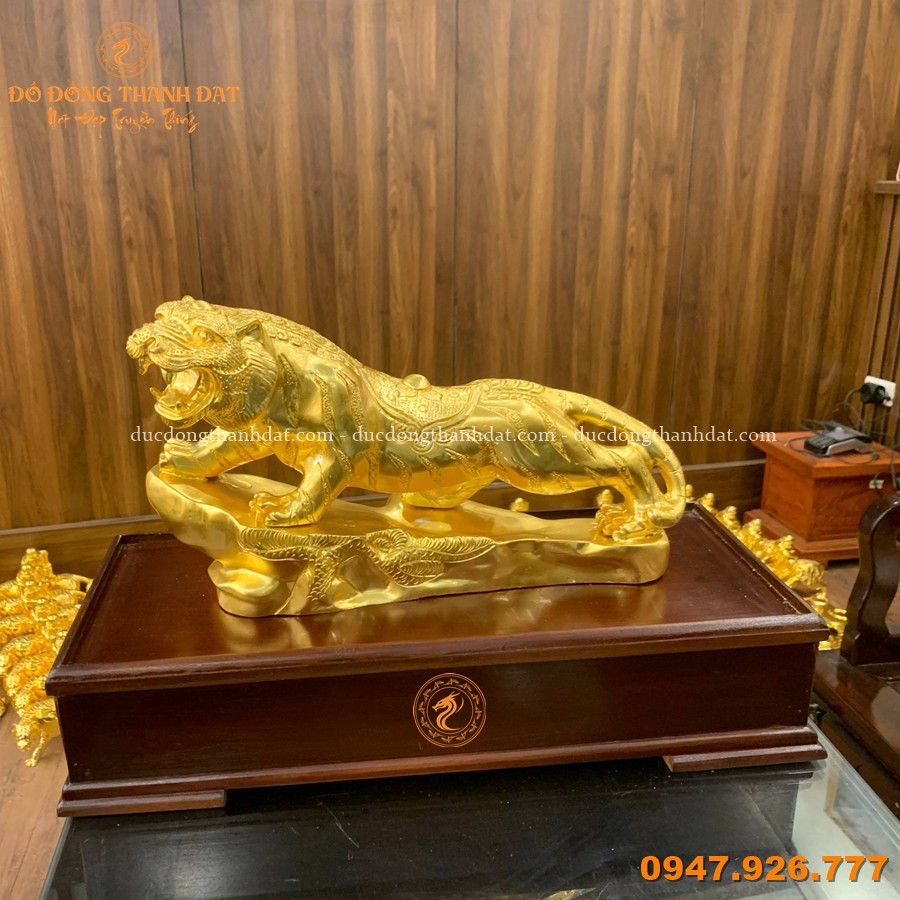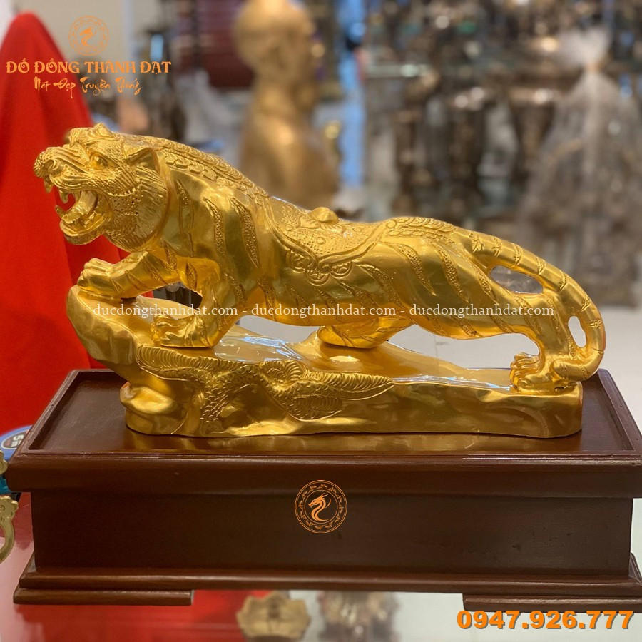 Tượng hổ đứng bệ đá dát vàng 9999 dài 35cm là mẫu linh vật phong thủy cao cấp, được chế tác tinh xảo tại Đúc Đồng Thành Đạt. Hình tượng hổ trong tư thế vươn mình, chân đặt trên bệ đá vững chắc thể hiện sức mạnh, quyền uy và tinh thần dũng mãnh.