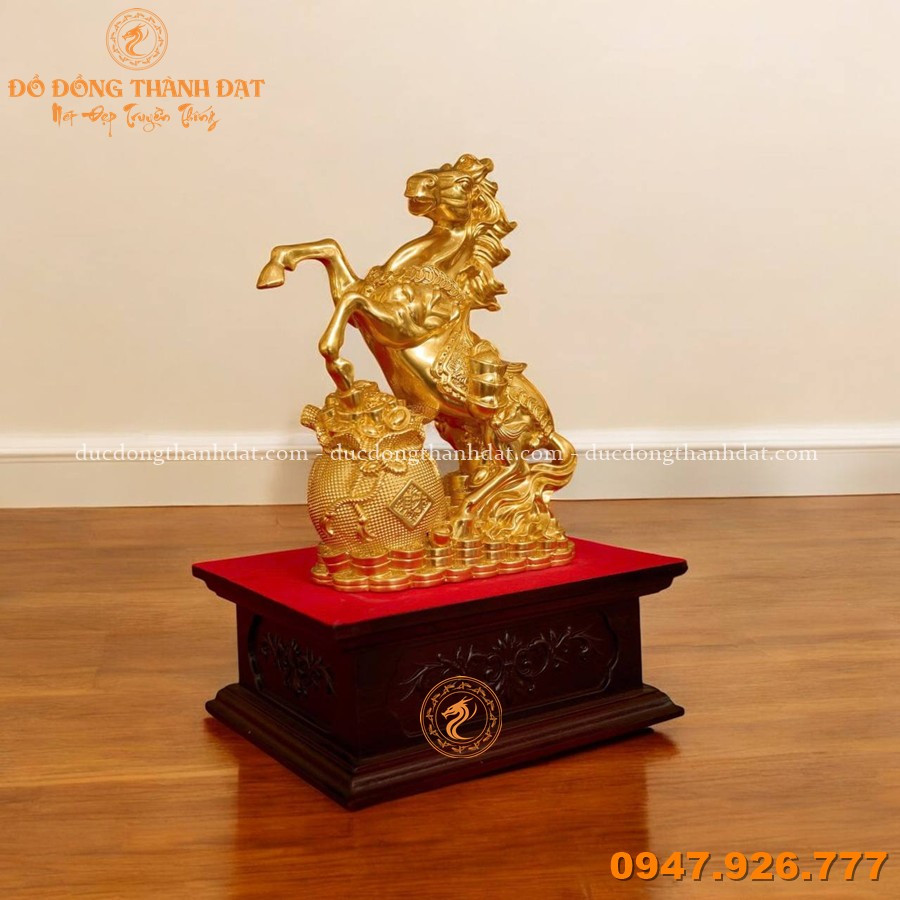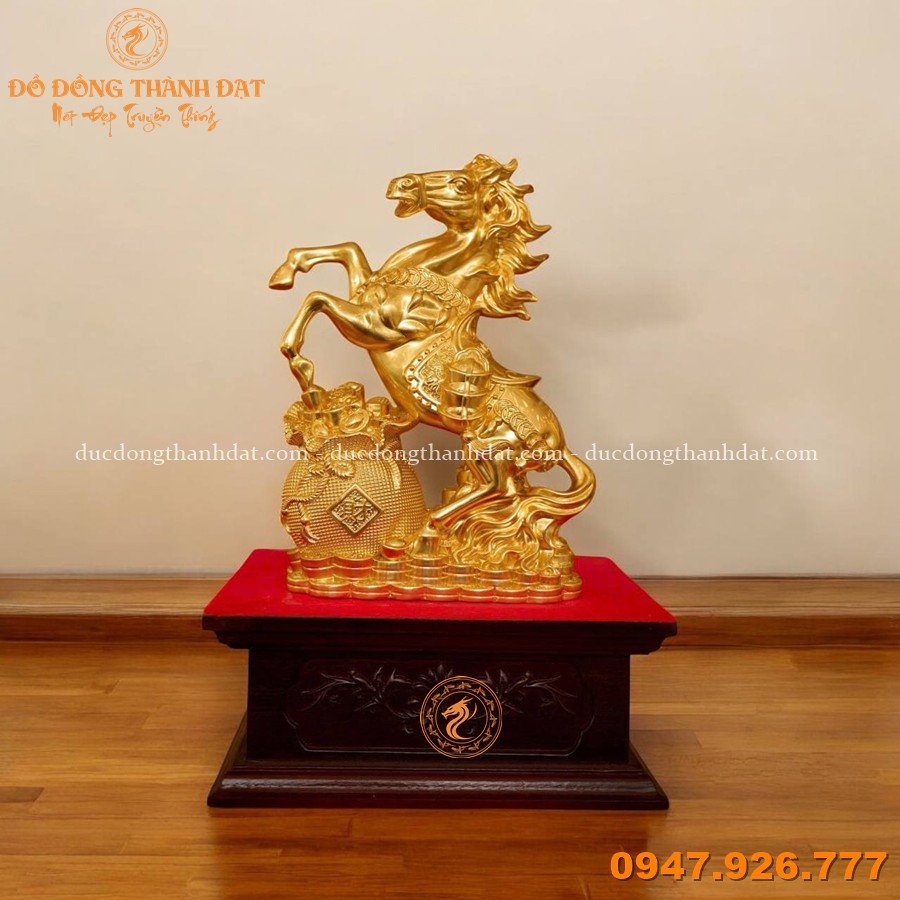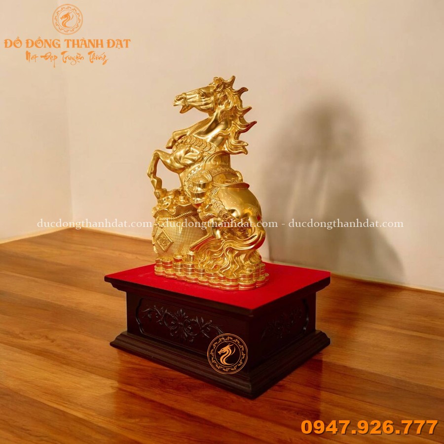Tượng Ngựa ôm hũ vàng cao 32cm là mẫu linh vật phong thủy cao cấp, được Đúc Đồng Thành Đạt chế tác tinh xảo từ đồng vàng thau, bề mặt dát vàng 9999 sang trọng, nổi bật. Hình tượng ngựa tung vó mạnh mẽ, thân ôm trọn hũ vàng và tiền xu cổ, biểu trưng cho tài lộc hội tụ – công danh thăng tiến – làm ăn phát đạt.