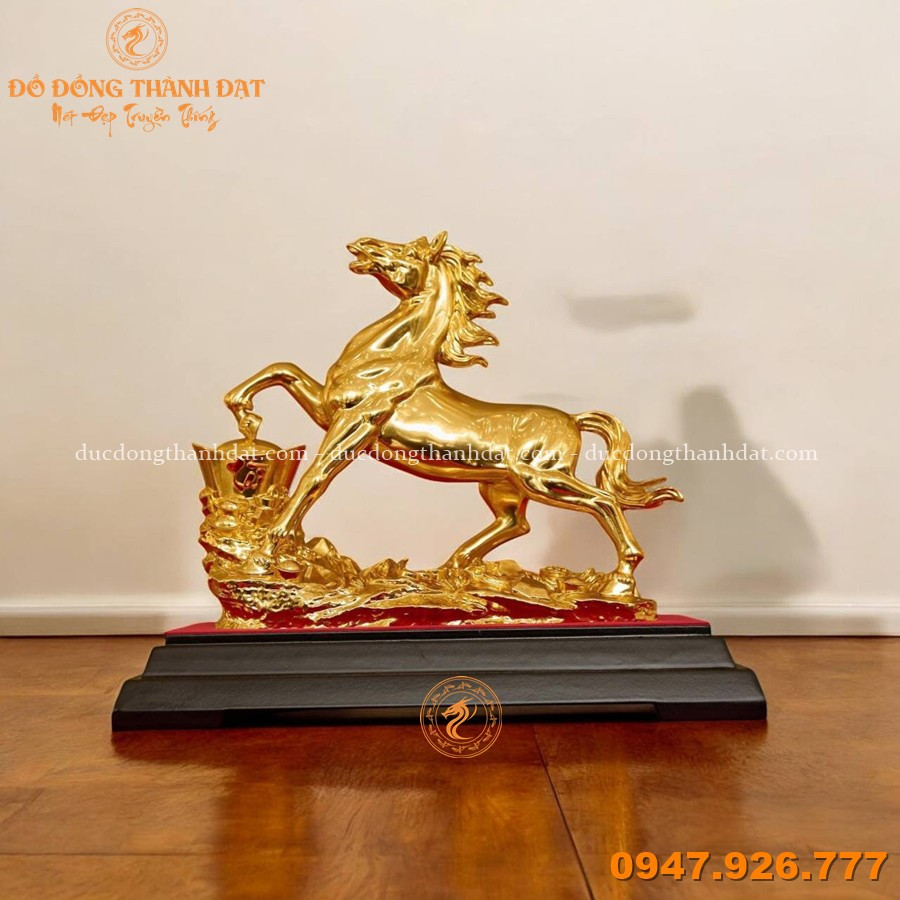 Tượng ngựa tài lộc dát vàng 9999 cao 22cm, ngang 28cm là mẫu linh vật phong thủy cao cấp được chế tác từ đồng, bề mặt dát vàng 9999 sáng bóng, sang trọng. Hình tượng ngựa trong thế phi nước đại, thân vươn dài mạnh mẽ, phía trước là biểu trưng tài lộc mang ý nghĩa tiền tài dồi dào – công danh thăng tiến – làm ăn hanh thông.