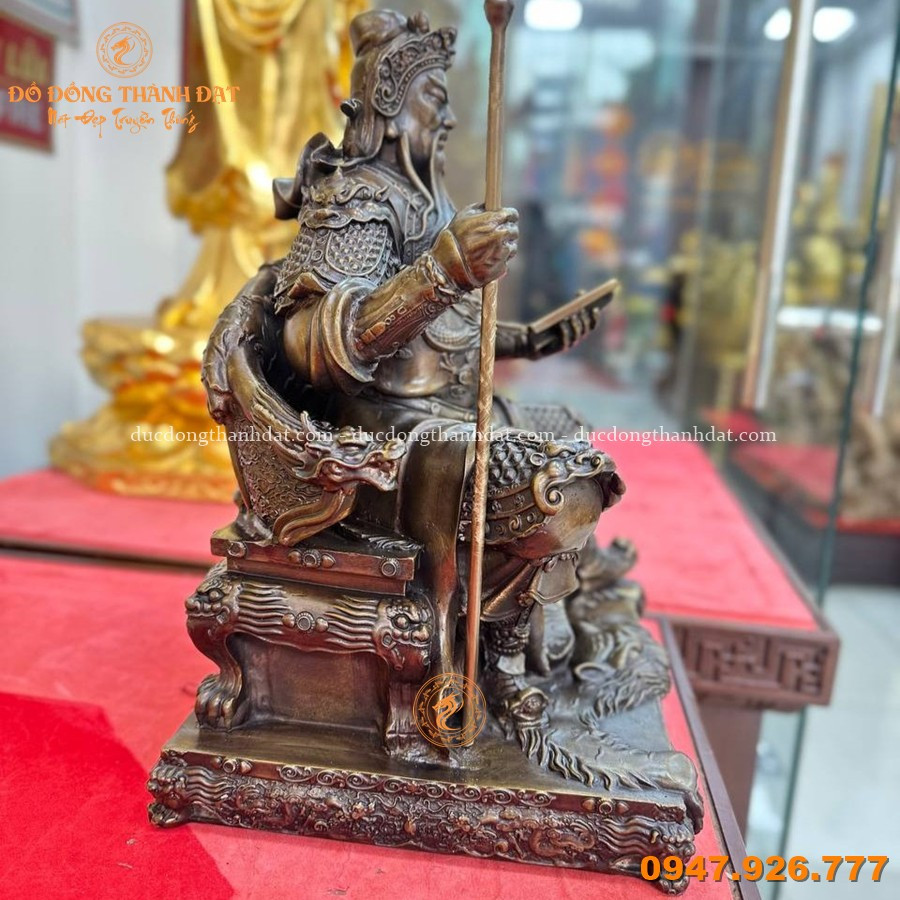 Mẫu Tượng Quan Công ngồi đọc sách đồng hun giả cổ cao 28cm tái hiện hình ảnh Quan Công trong tư thế trầm tĩnh, tay cầm cuốn sách, gương mặt nghiêm nghị nhưng đầy trí tuệ. Hình tượng này thể hiện một khía cạnh khác của vị tướng huyền thoại: sự uyên bác, điềm tĩnh và trí tuệ sâu sắc.