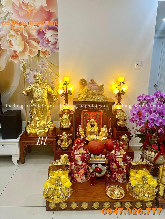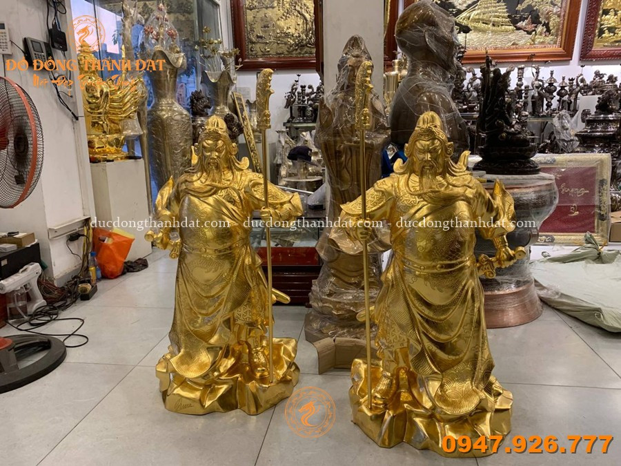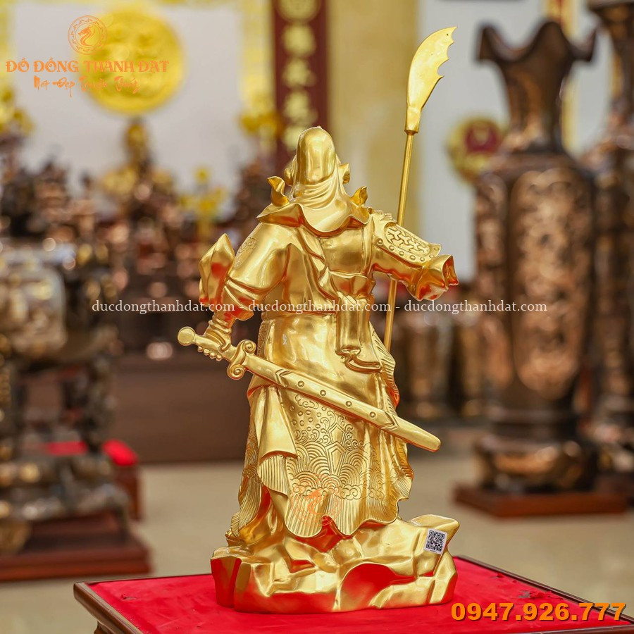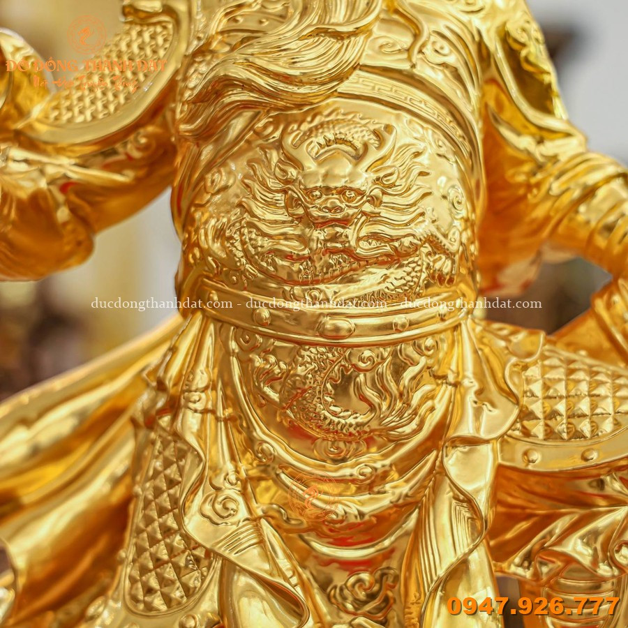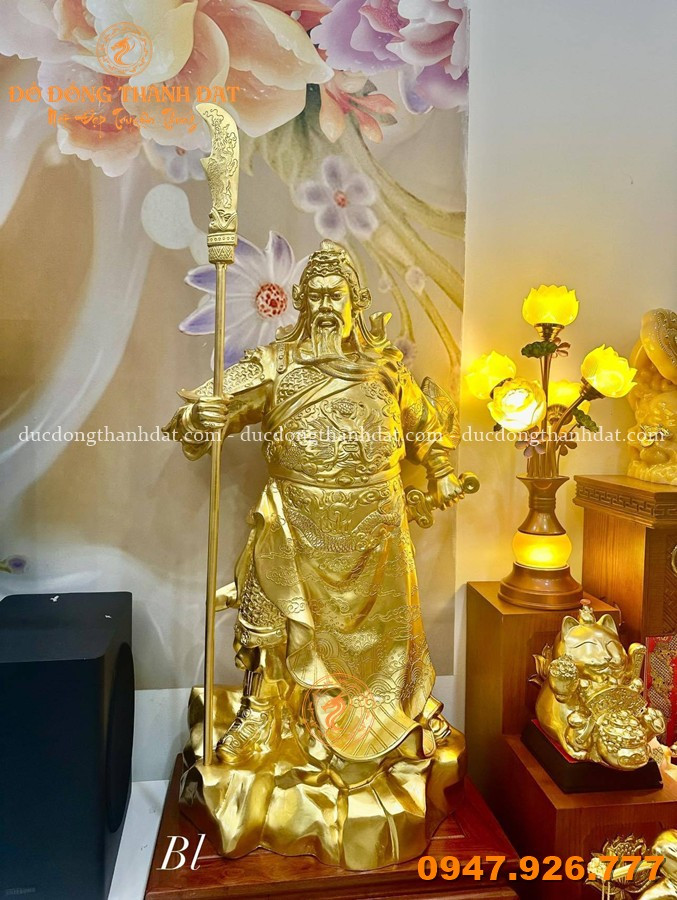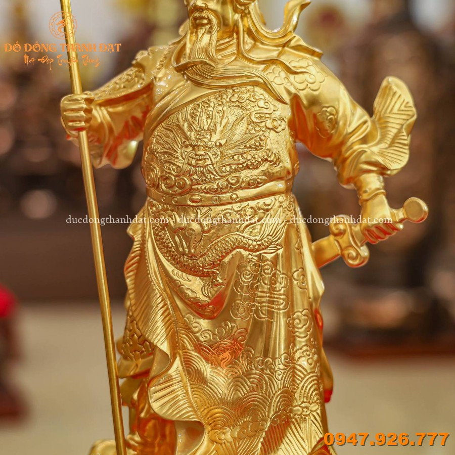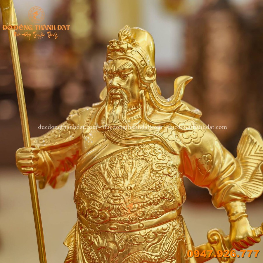 Tượng Quan Vân Trường dát vàng 9999 cao 70cm dòng tượng đồng cao cấp được chế tác công phu tại Đúc Đồng Thành Đạt, hội tụ vẻ đẹp nghệ thuật truyền thống cùng giá trị phong thủy sâu sắc. Sản phẩm không chỉ mang tính thẩm mỹ cao còn thể hiện khí chất uy nghi, mạnh mẽ của vị danh tướng nổi tiếng thời Tam Quốc.