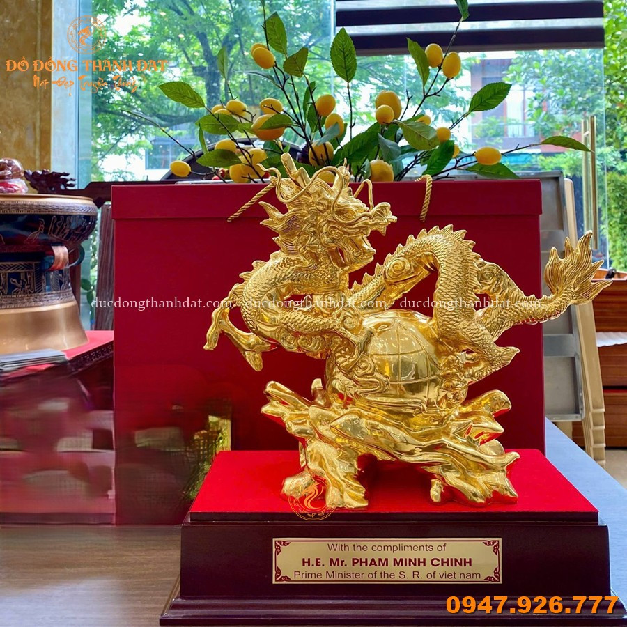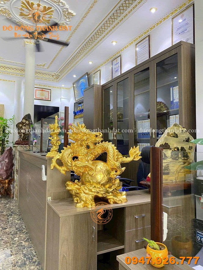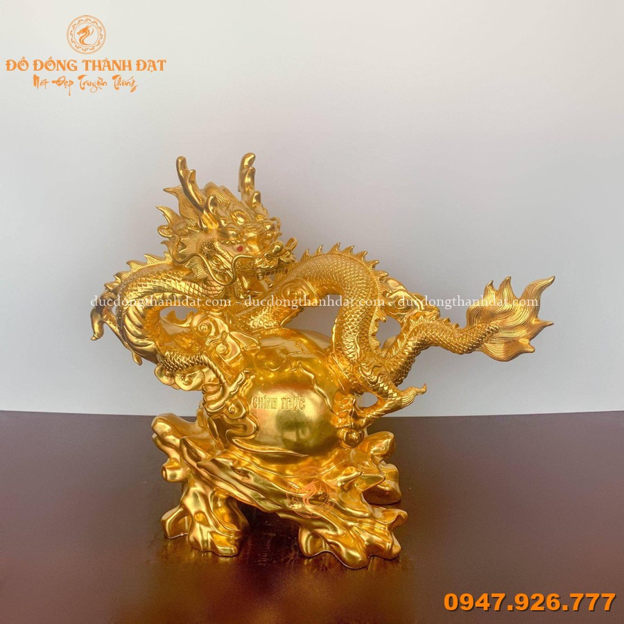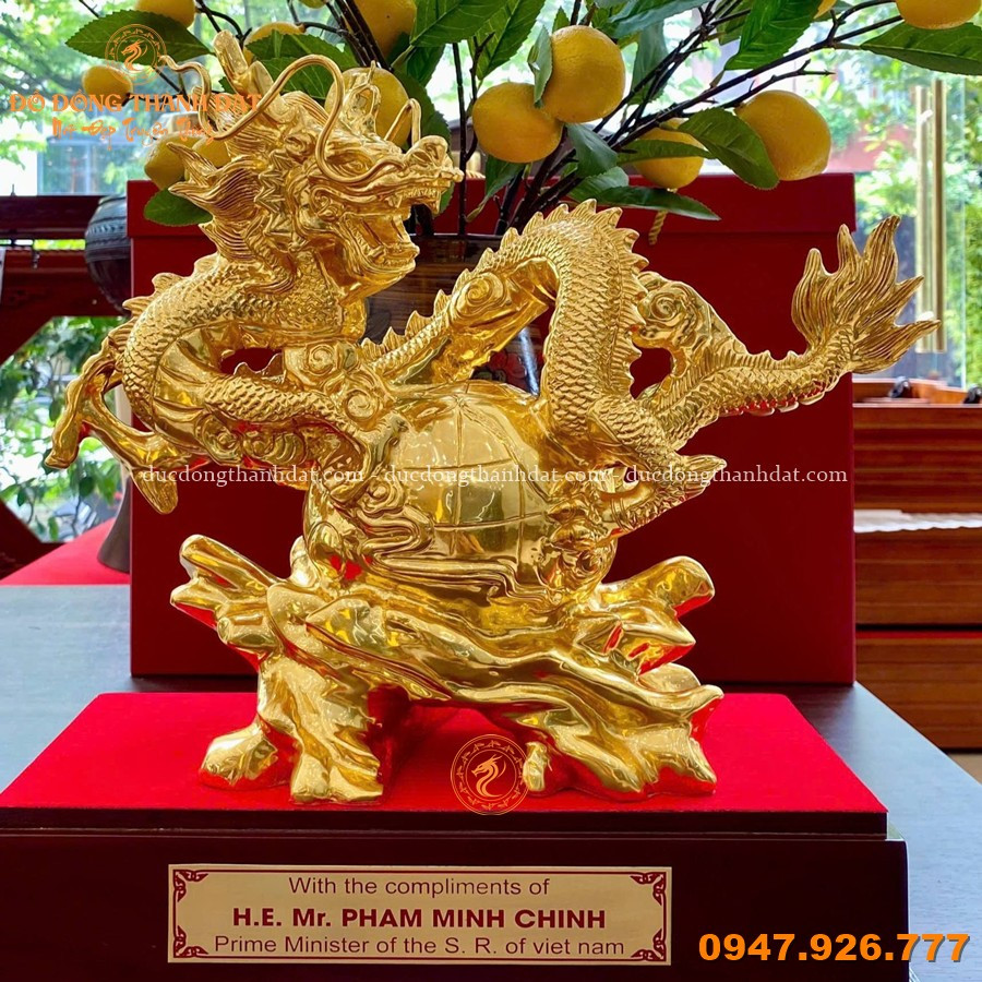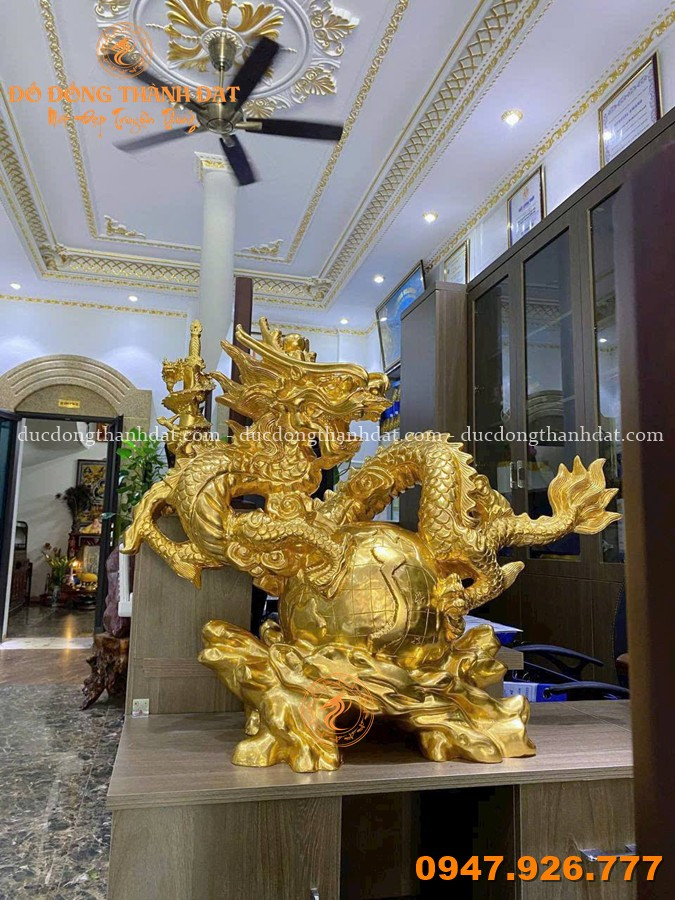 Mẫu tượng rồng ôm địa cầu dát vàng 9999 kích thước 55x45cm tại Đúc Đồng Thành Đạt là một trong những thiết kế tiêu biểu, hội tụ đầy đủ yếu tố nghệ thuật – phong thủy – đẳng cấp.