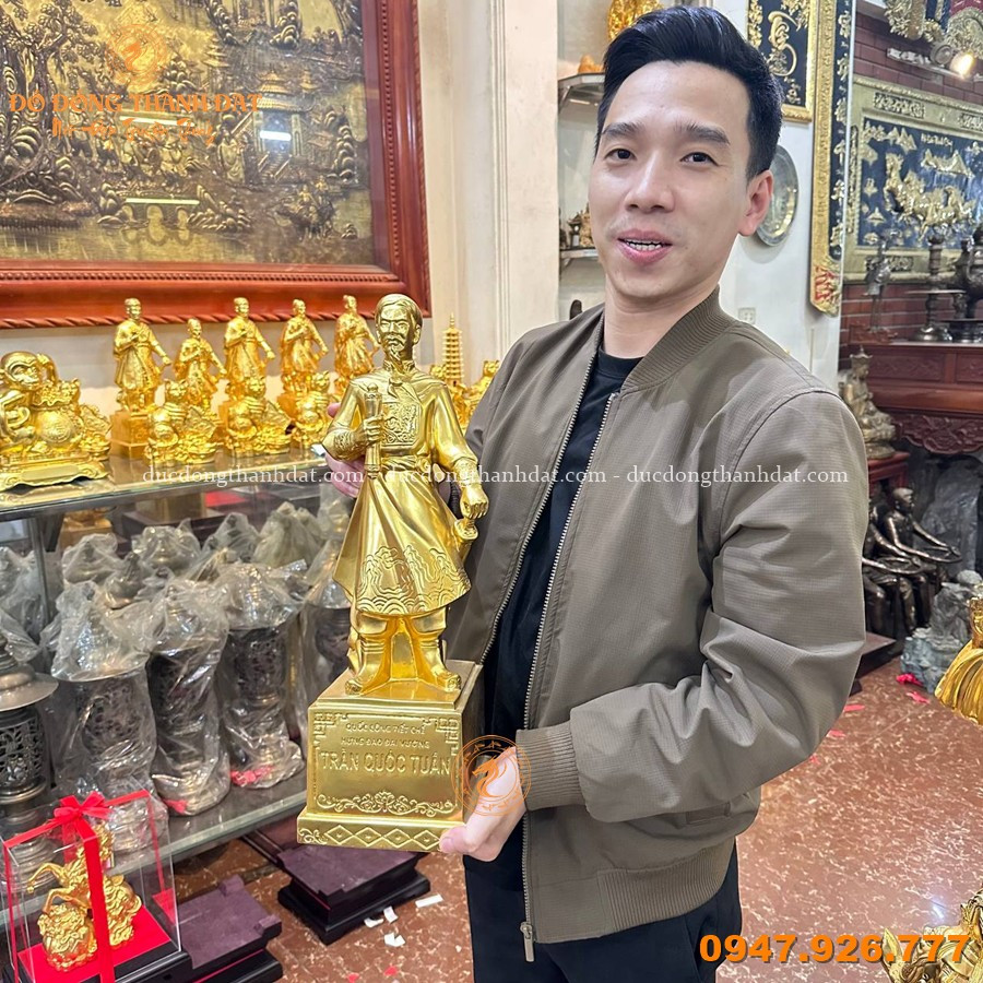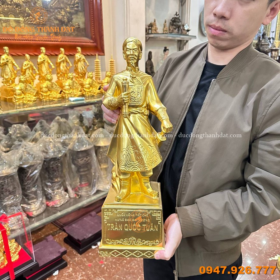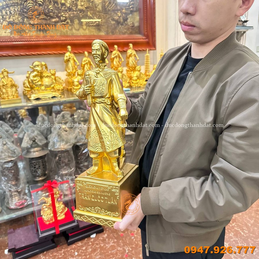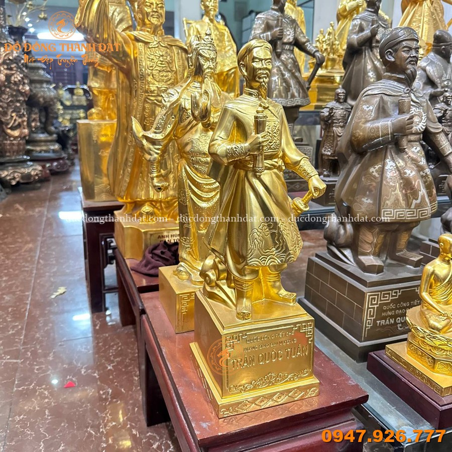 Tượng Trần Quốc Tuấn dát vàng CN cao 50cm là tác phẩm nghệ thuật được chế tác tinh xảo, tái hiện hình ảnh vị Quốc Công Tiết Chế oai phong, tay cầm hịch tướng sĩ, thần thái cương nghị – biểu tượng của tinh thần yêu nước và trí tuệ quân sự lỗi lạc.